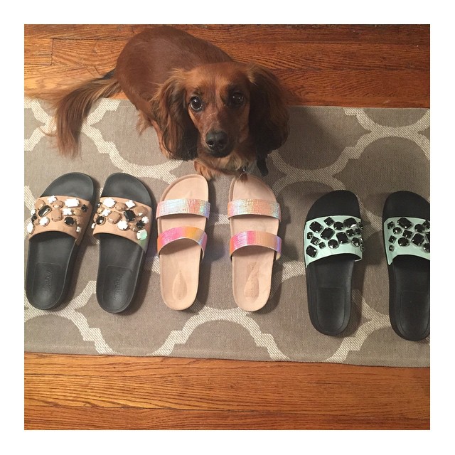 I was lucky that the Loeffler Randall Sample Sale was near my office last month. So I went after work on a Friday to Soho… Finally got to 151 Wooster Street, and saw that the line was a block long! So I waited an hour to get in but it was definitely worth it! I bought 3 pairs of sandals. (I’ve been lusting after these sandals for months!) I got the Paz sandals in the fab pink iridescent, 2 pairs of the Cat Pool Side sandals (in Wheat/Multi and Mint/Black) each were $100. Of course I Instagrammed my fab buys once I got home. Dolce was pleased with my purchases as seen below: