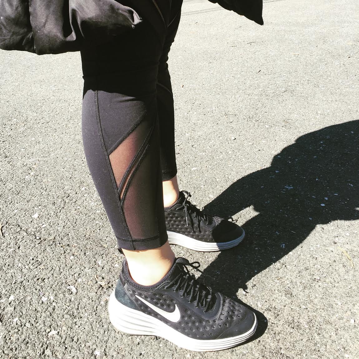 I hate jeans. If I could wear yoga pants every day I would. (I wear leather leggings to work, since they’re more acceptable to work in than yoga pants.) So once it’s the weekend you will find me in leggings, because to me they are pants- if your shirt covers your butt, then you’re good to go. But to be on the safe side, you should always always check your butt to make sure your leggings aren’t see through, because there have been so many times I’ve seen girls walking around with their thong showing through their sheer leggings. #AWKWARD. So this weekend, I wore my favorite Lululemon leggings with sheer mesh cut outs and my Lunar Sky Elite Nike Sneakers. (See pic below).