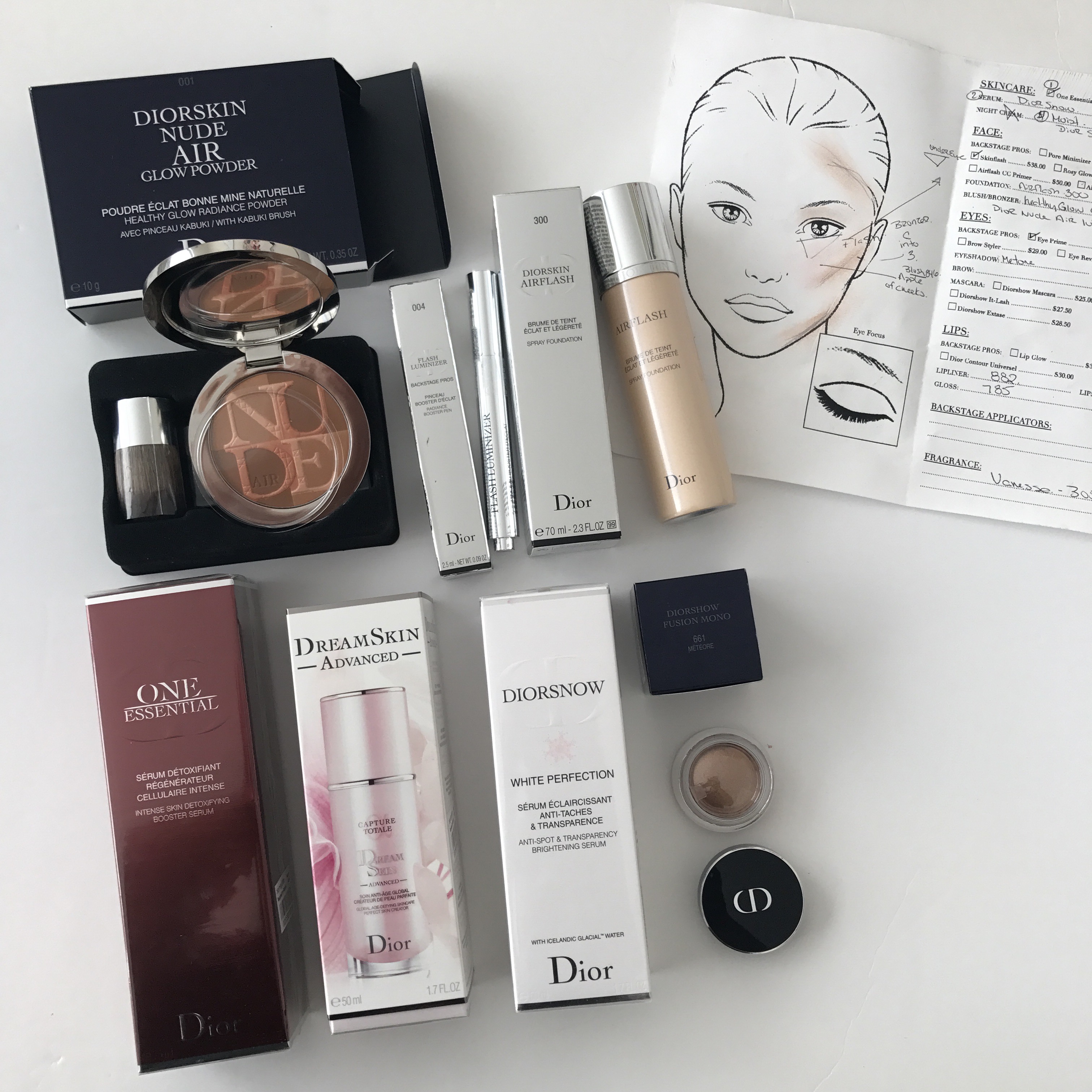 She completely took off my makeup and put the above in that same order. She then put on the airflash (#300) and did my eye makeup. Loved all the eye shadow she used on me.