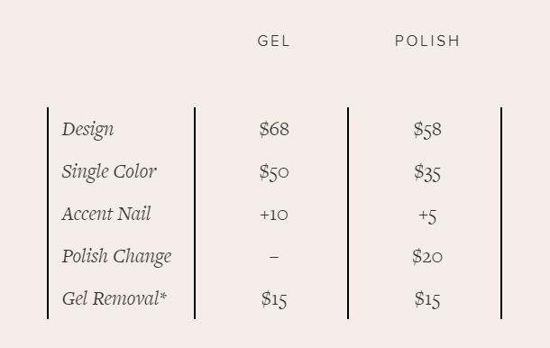 It is a bit on the pricier side (I had a vendor at work pay for my mani). Hence, why I don’t go there often. I’m also not a gel person, I get weekly manis and constantly change my mani because my nails grow so fast. I also think long nails are gross. Below is their pricing: