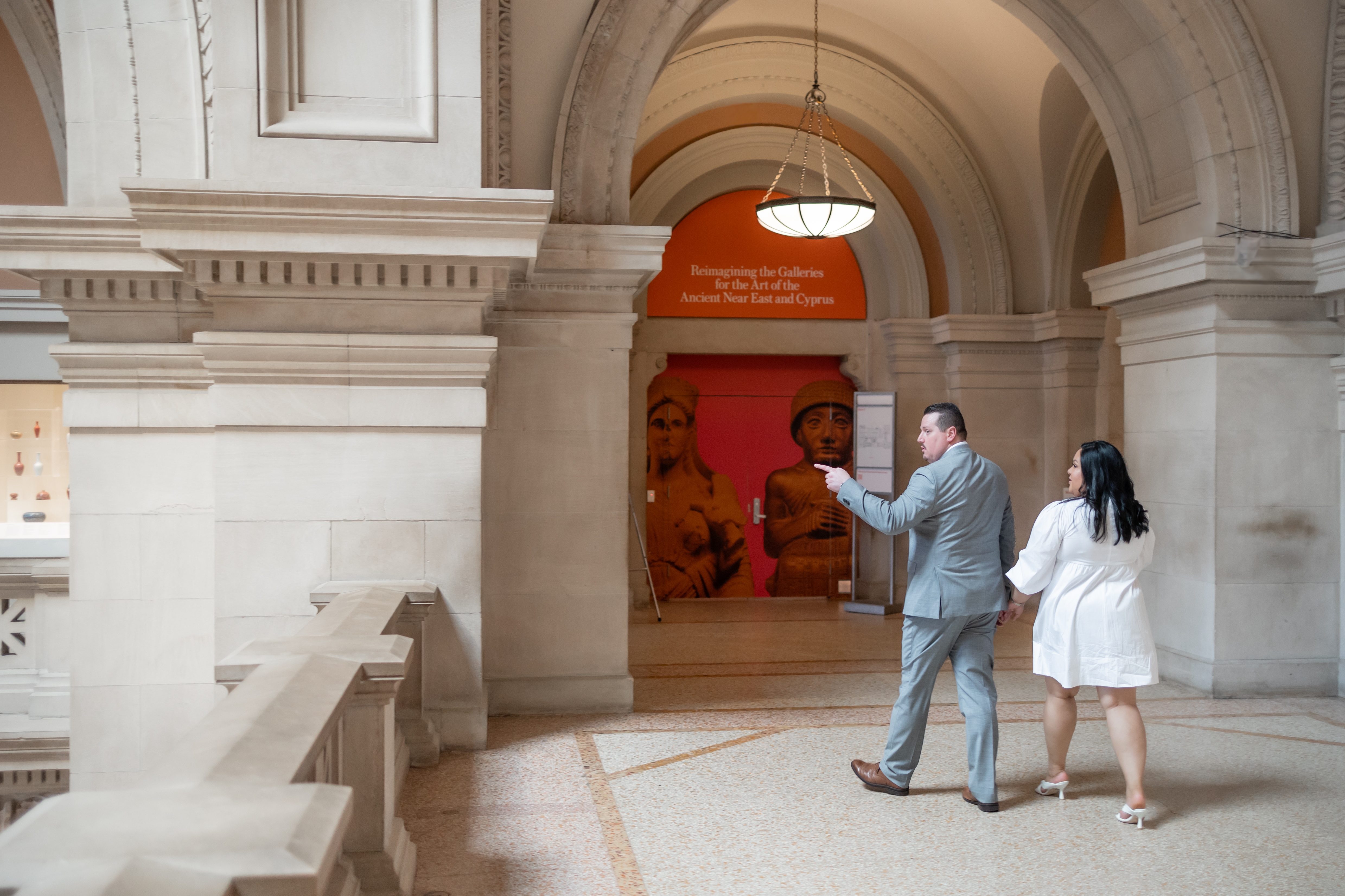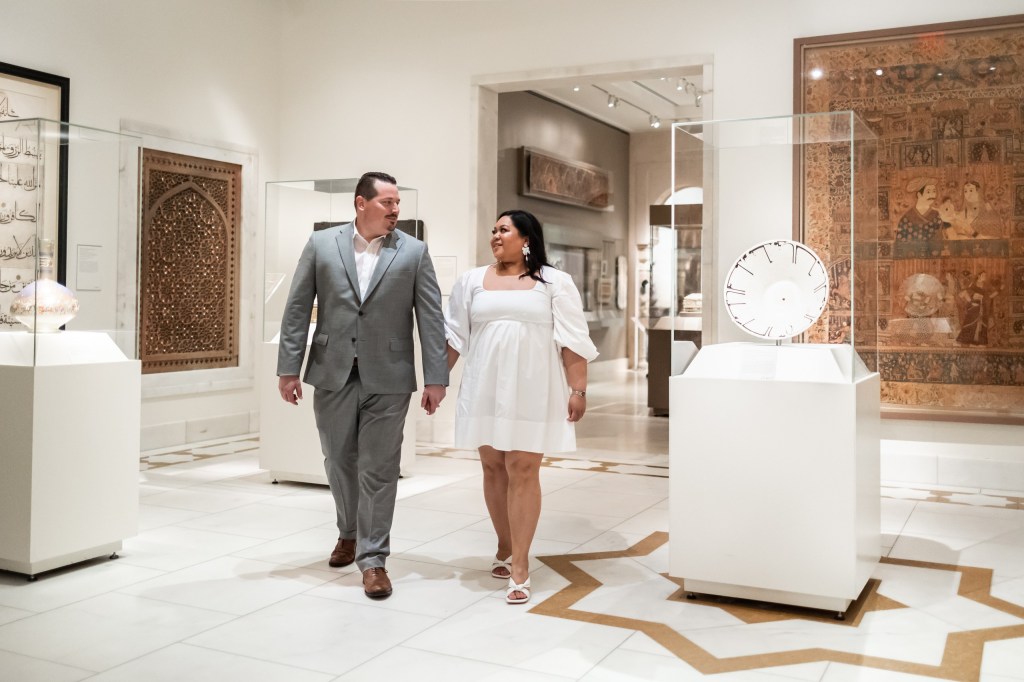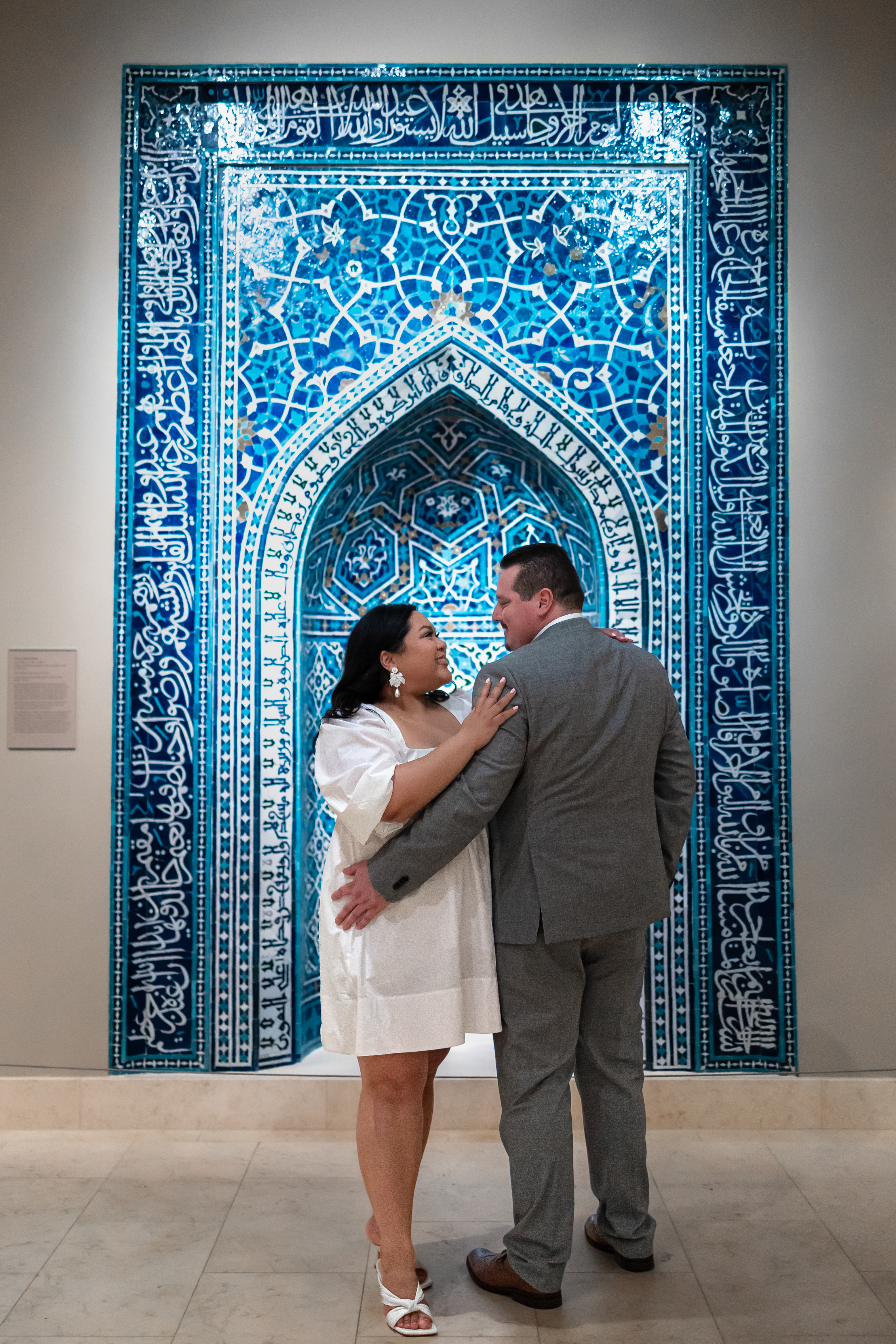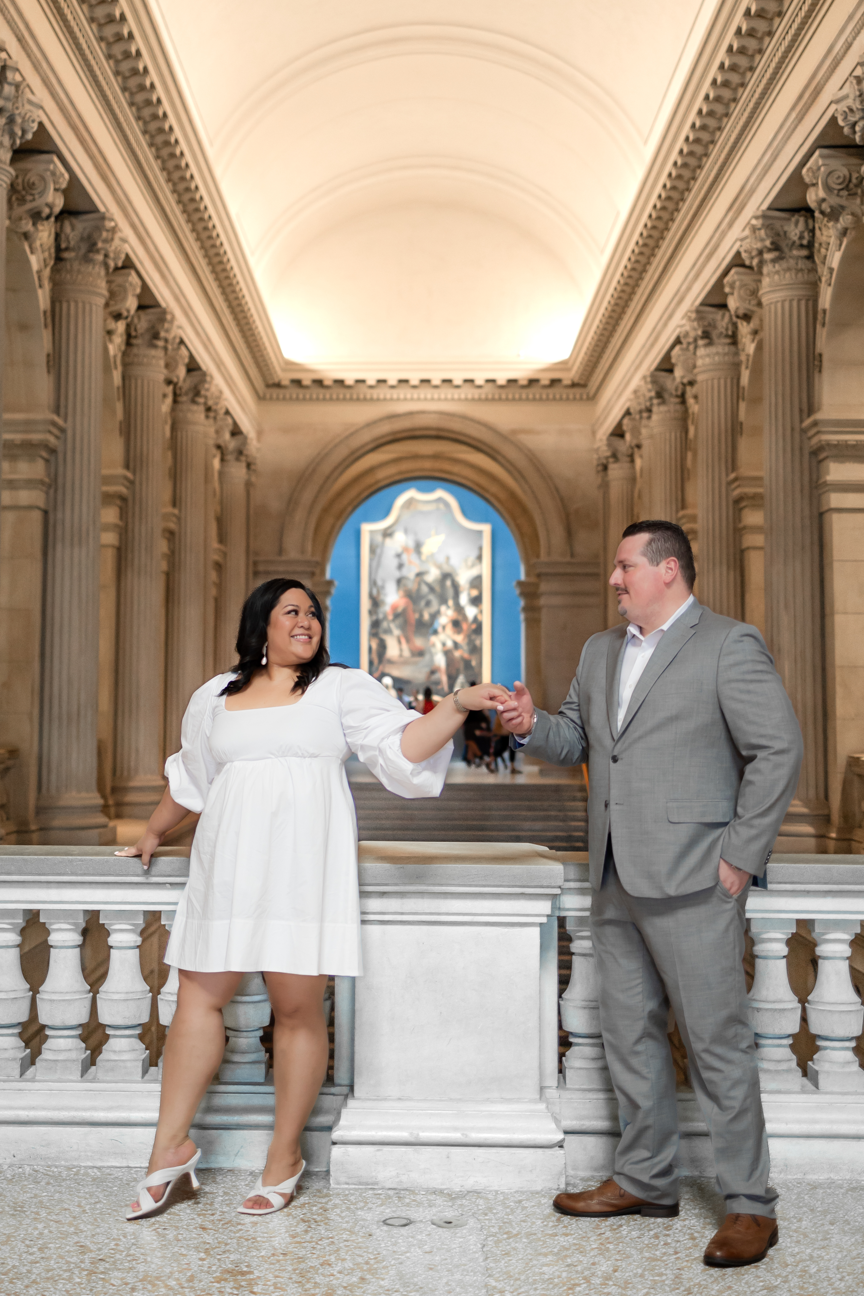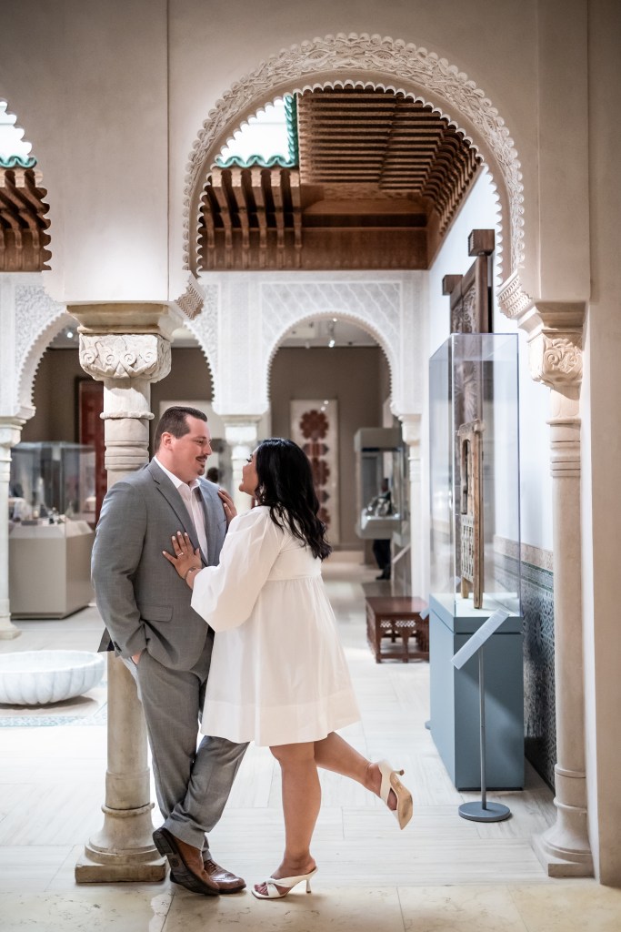 Inside the museum, among the sculptures and grand halls, capturing intimate, candid moments surrounded by timeless works of art.