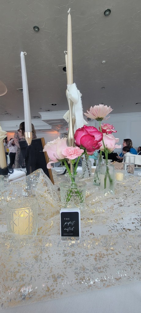 Each table had bud vases with pink florals, surrounded by votive candles for a soft, romantic vibe. (Shout out to Costco for the flowers, they were amazing!). I bought the bud vases off Amazon during one of their Prime sale days.
