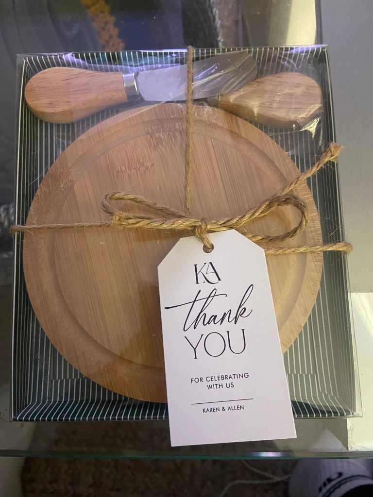 As for our shower gift to our guests, we wanted to give something that people would use and want. And doesn’t scream wedding. (Lets be for real, how many shower gifts have you thrown away because they were heart shaped or had the bride’s name all over it?). We also wanted our gift to be something that is very us. Allen and I both love hosting and charcuterie boards, so we gifted all our guests a mini personalized charcuterie board.