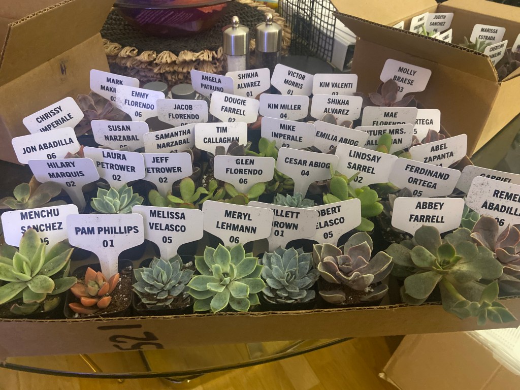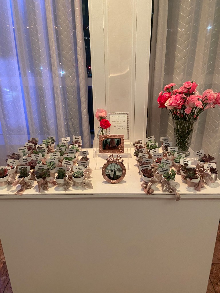 For escort cards, we had small succulents with signs with their name on it. I used my cricut to print out everyone’s name. I bought the succulents and holders off Amazon. And of course to tie it into the theme, I added the same ribbon I used with the candle holders.