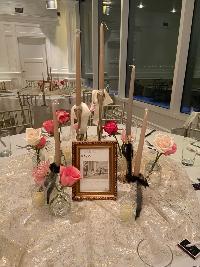 I sourced candle holders for months—mixing vintage and new, crystal and gold/silver finishes—to create tablescapes that sparkled from every angle. We used different shades of neutral, gold, and black ribbons to tie bows on everything—because again: obsessed.Our table numbers were black and white photos of us (Karen & Allen!) tied to fun facts about our relationship. It was such a fun, personal touch that guests loved reading.