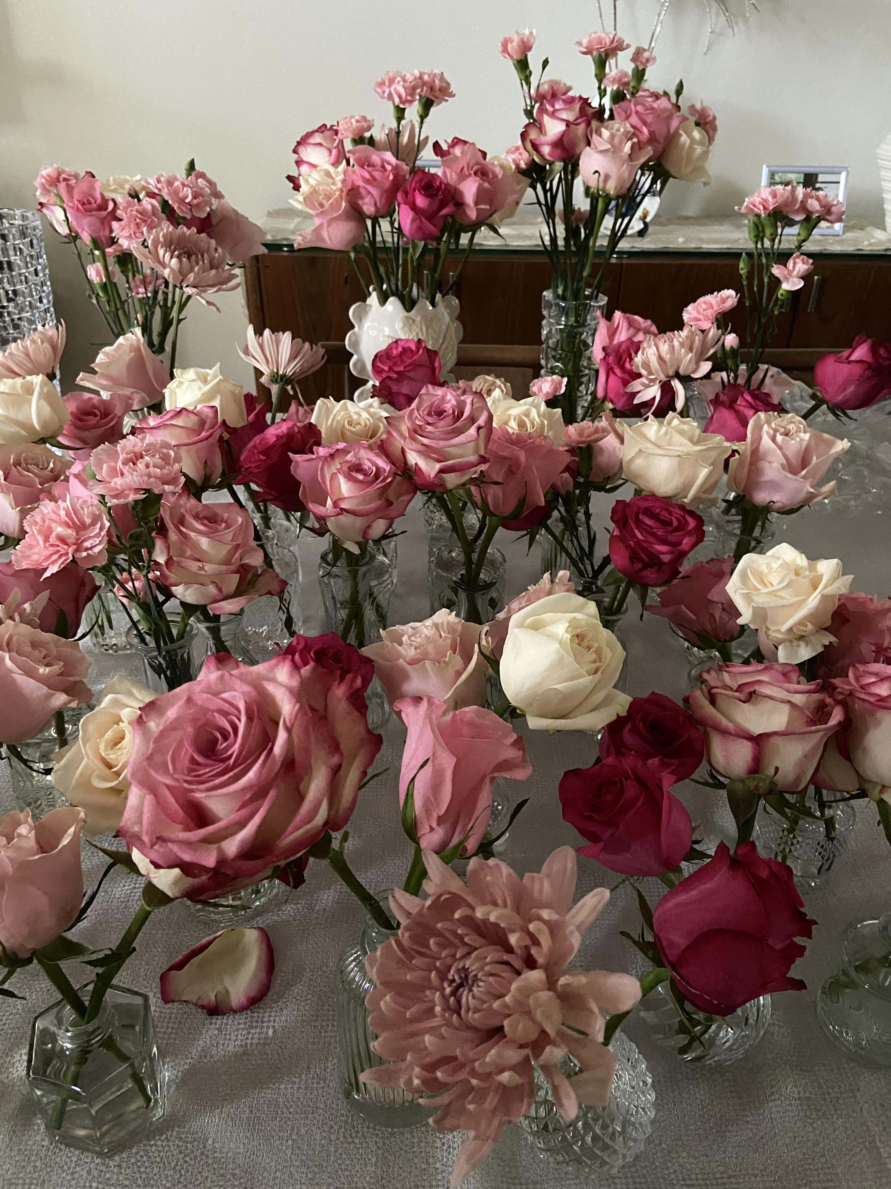 Each table had bud vases with pink florals, surrounded by votive candles for a soft, romantic vibe. (Shout out to Costco for the flowers, they were amazing!). I bought the bud vases off Amazon during one of their Prime sale days.