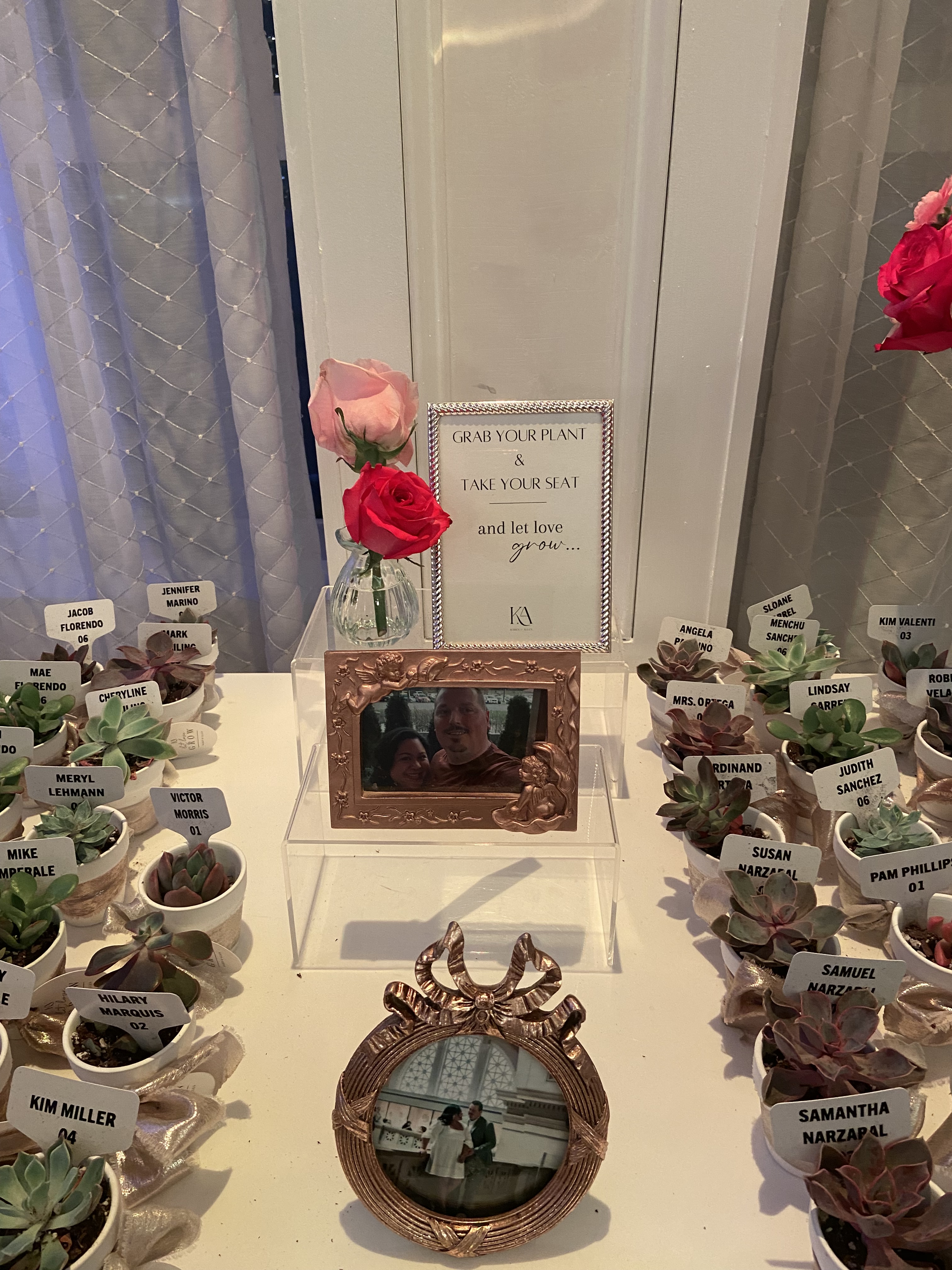 For escort cards, we had small succulents with signs with their name on it. I used my cricut to print out everyone’s name. I bought the succulents and holders off Amazon. And of course to tie it into the theme, I added the same ribbon I used with the candle holders.