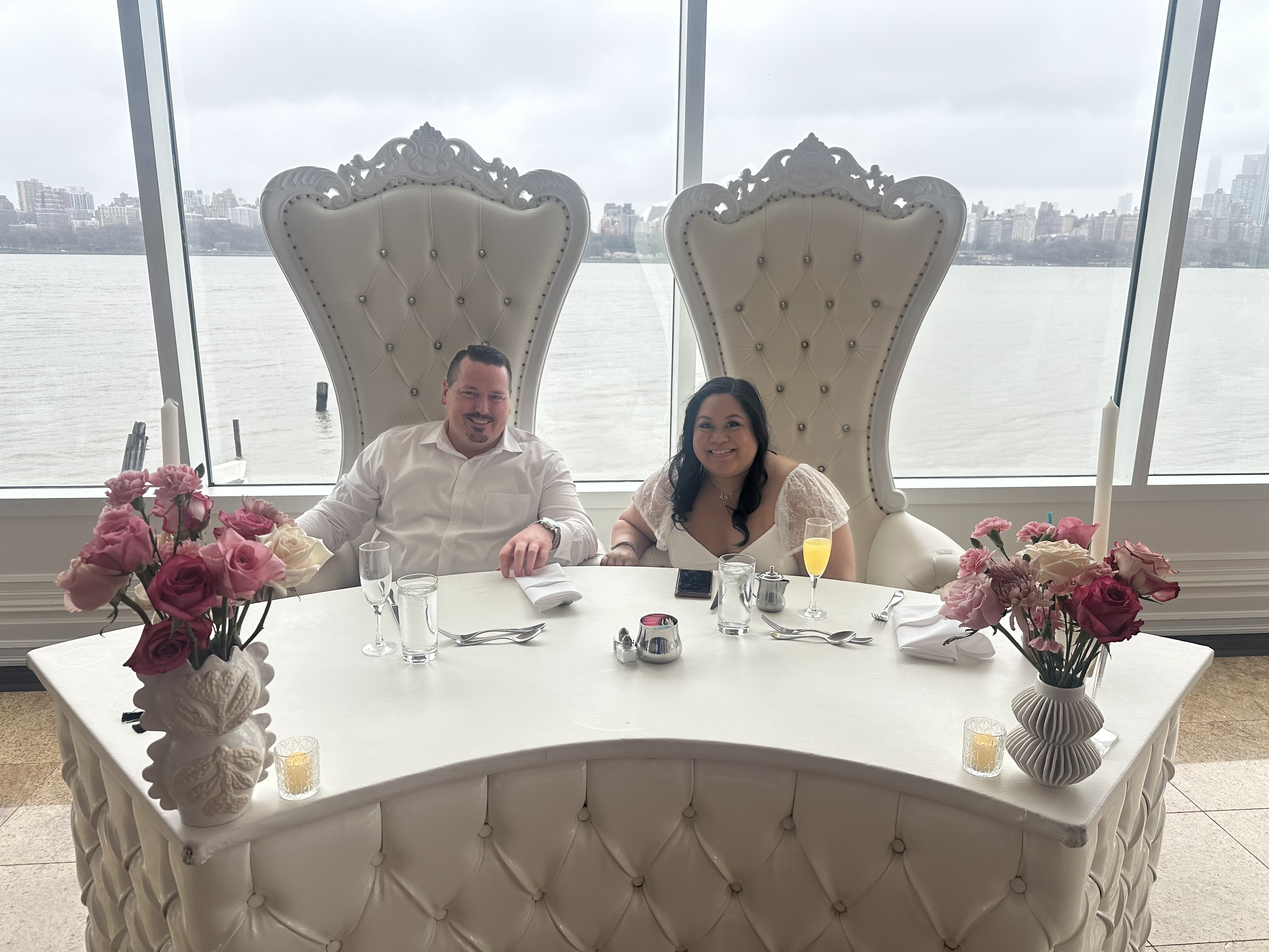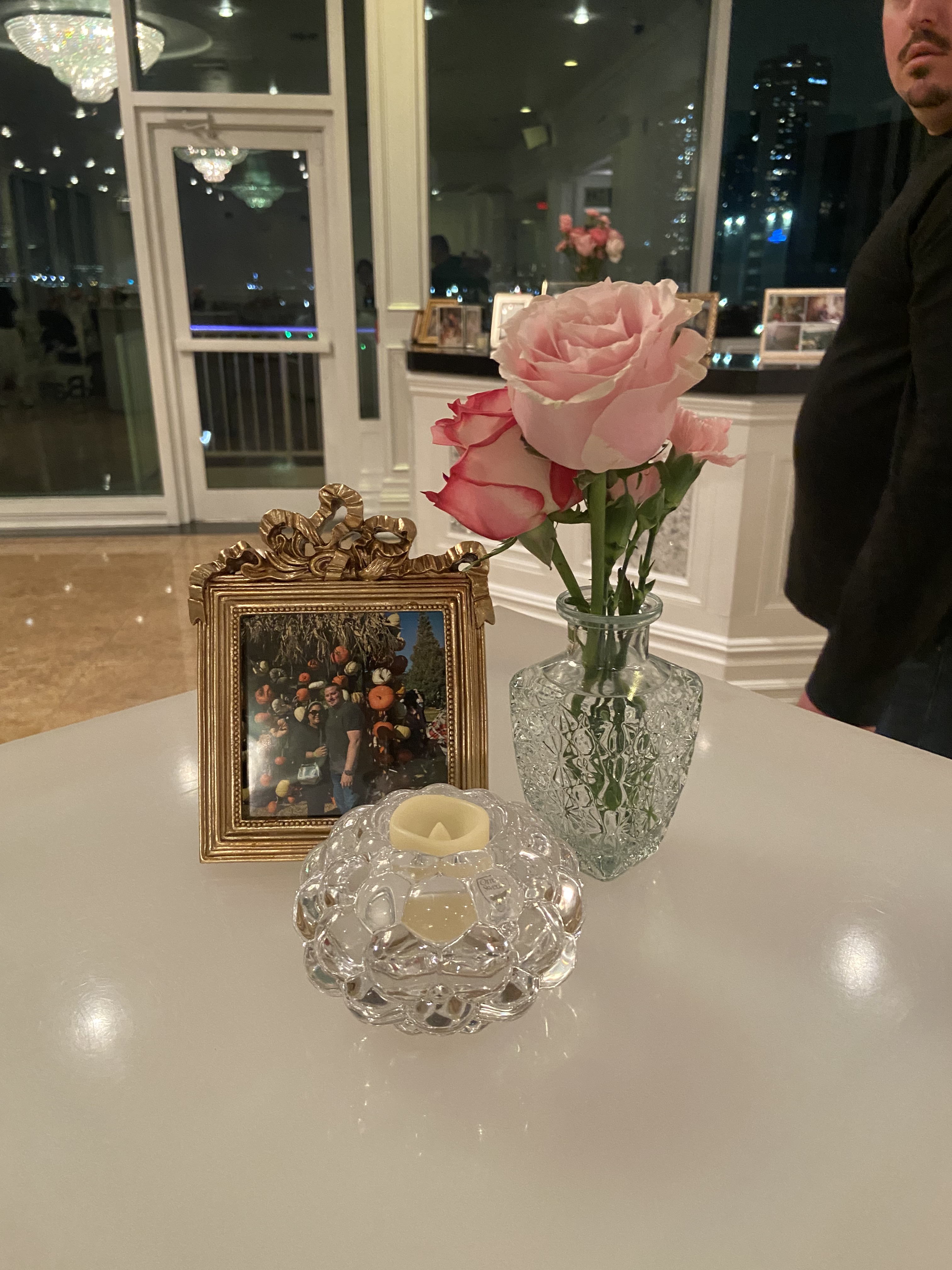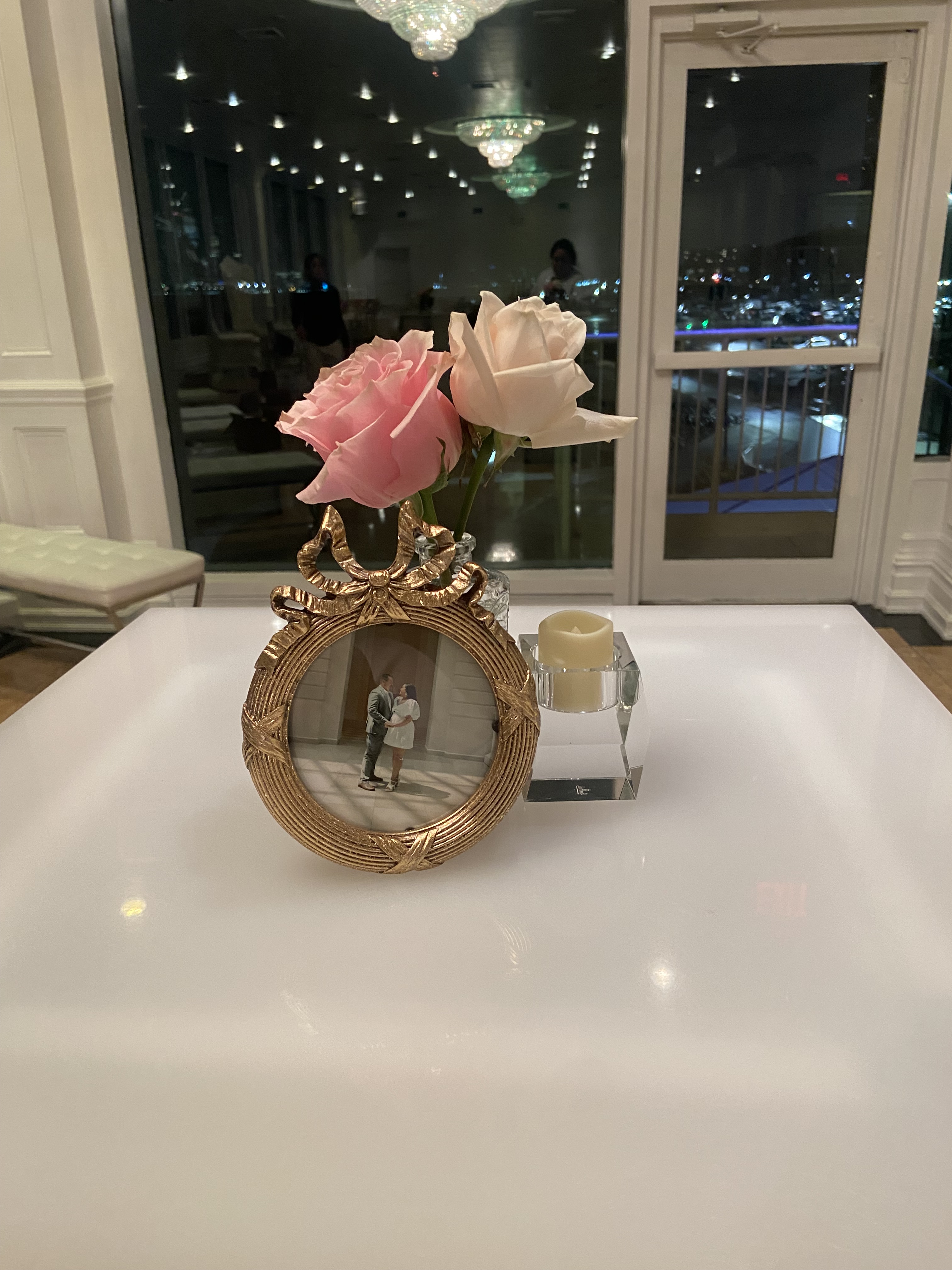 We also had high top tables for people to be able to talk and hang out for those who weren’t dancing. Or just enjoy the mimosa bar. Each high top had photos of us and votive candles.