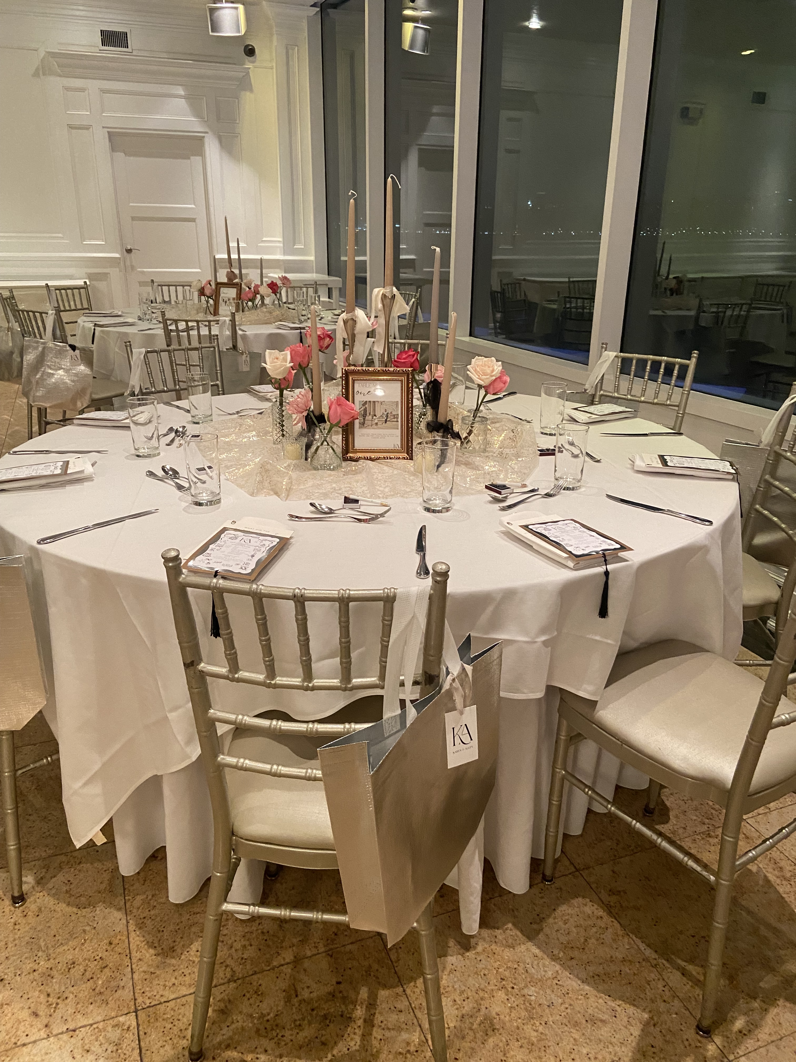 I sourced candle holders for months—mixing vintage and new, crystal and gold/silver finishes—to create tablescapes that sparkled from every angle. We used different shades of neutral, gold, and black ribbons to tie bows on everything—because again: obsessed.Our table numbers were black and white photos of us (Karen & Allen!) tied to fun facts about our relationship. It was such a fun, personal touch that guests loved reading.