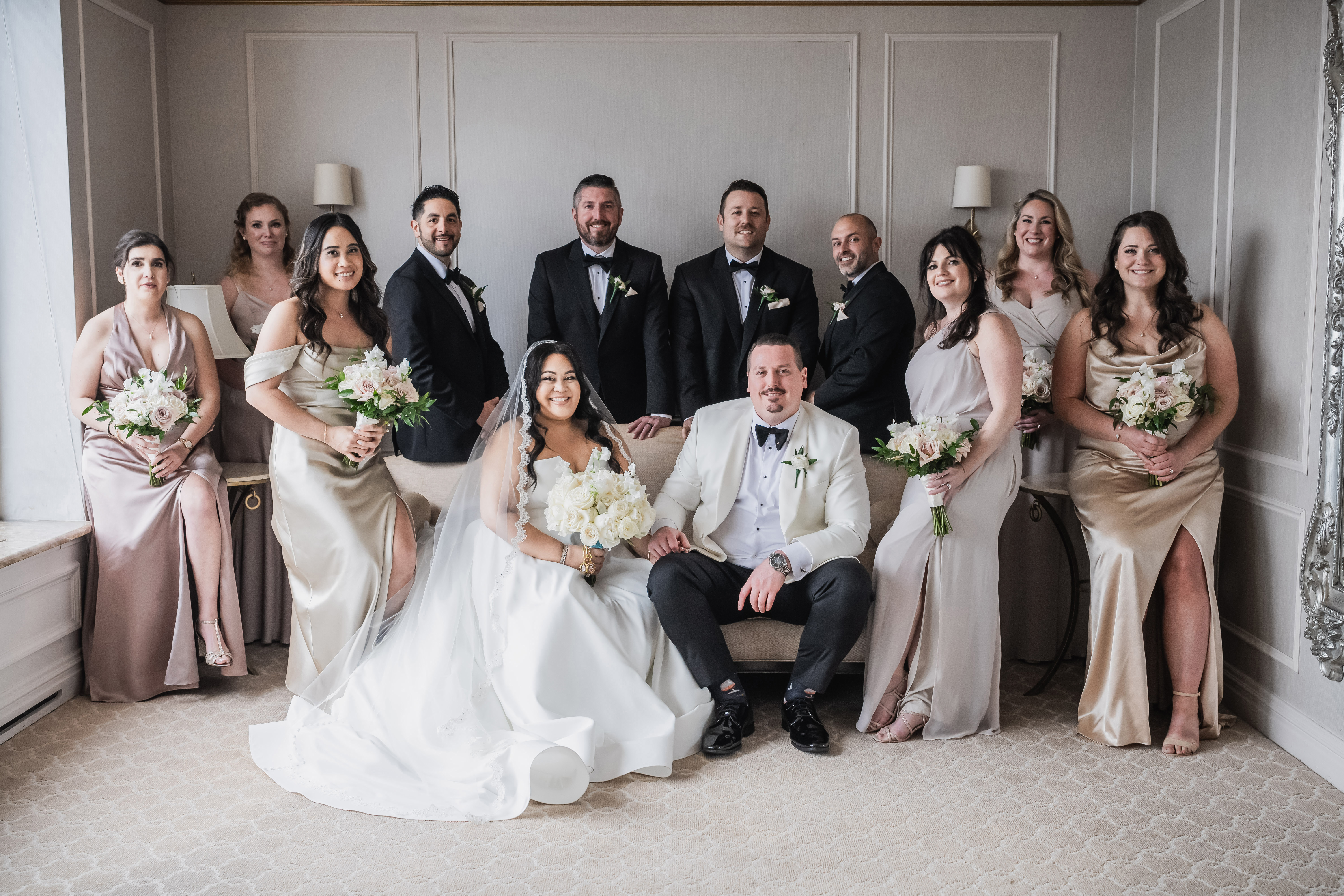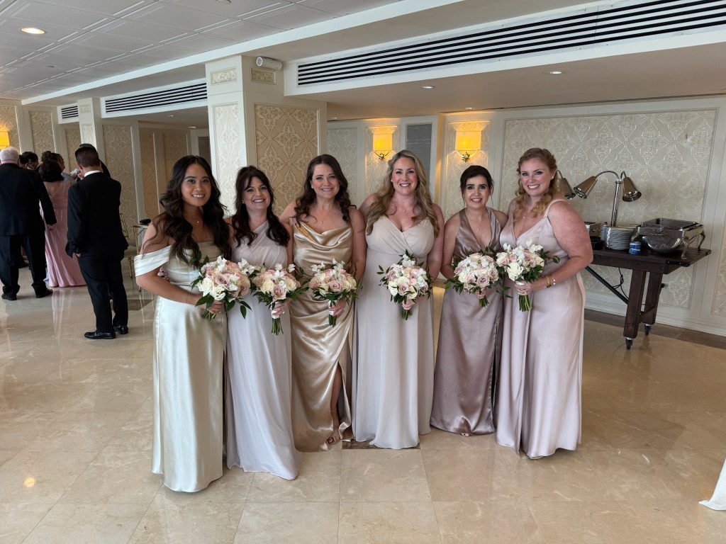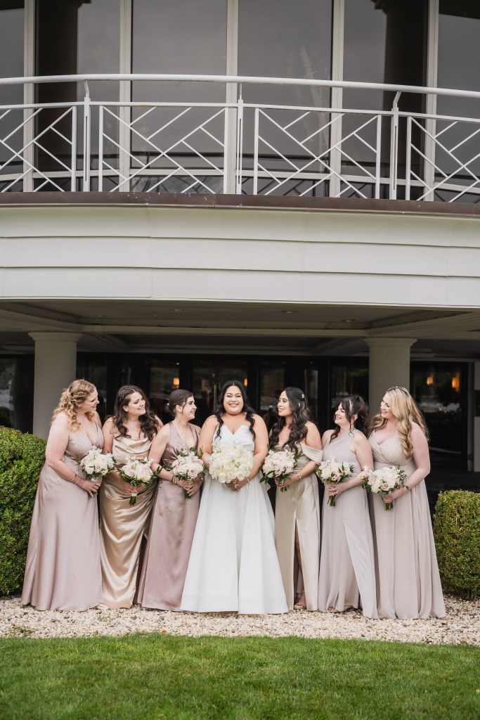 From the beginning, I knew I didn’t want my bridesmaids in matching dresses. Instead, I was drawn to the effortless beauty of mismatched neutrals — flowing gowns in a mix of soft tones and luxurious fabrics, like chiffon and satin. I wanted the final look to feel cohesive, yet unique to each of the amazing women standing beside me.