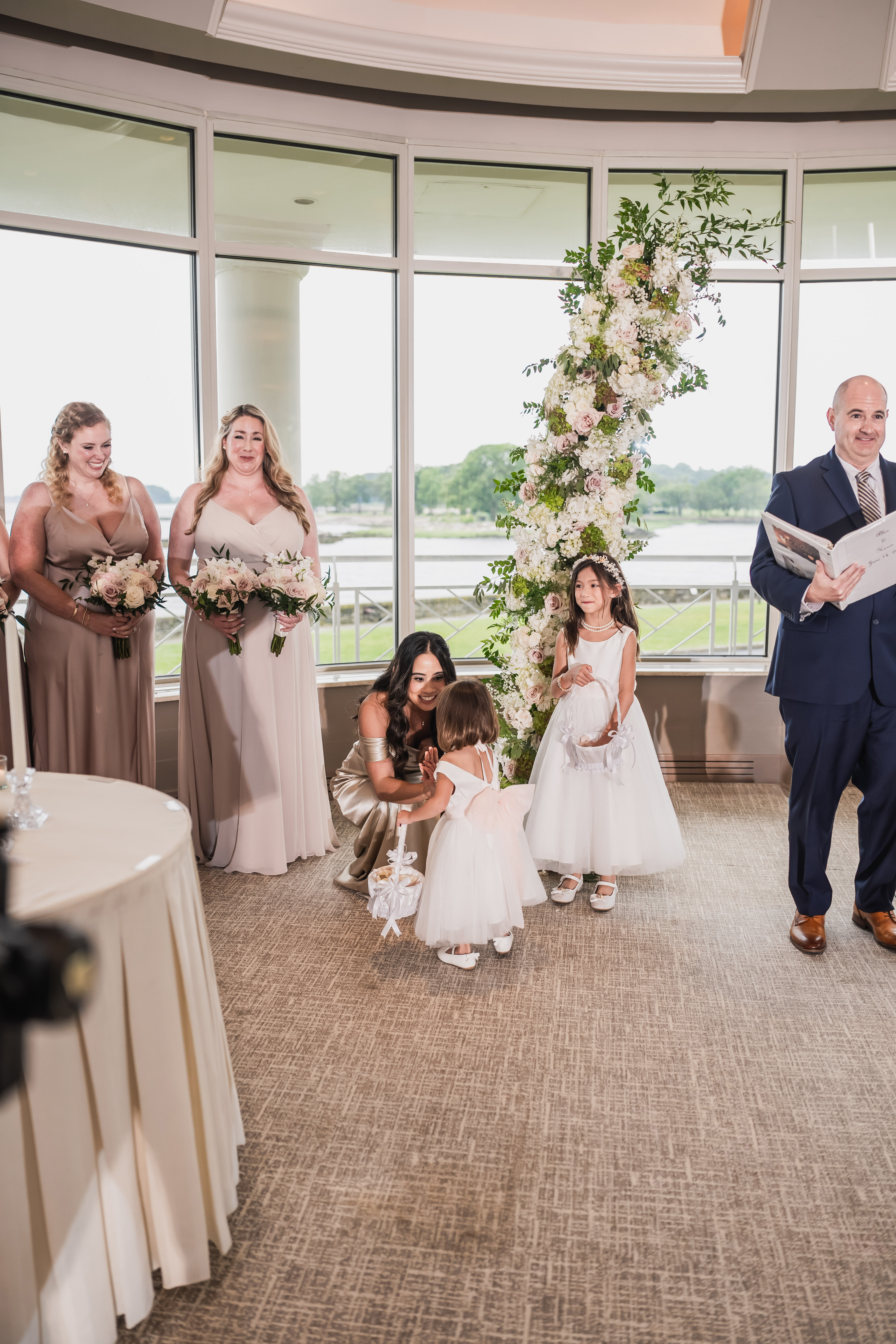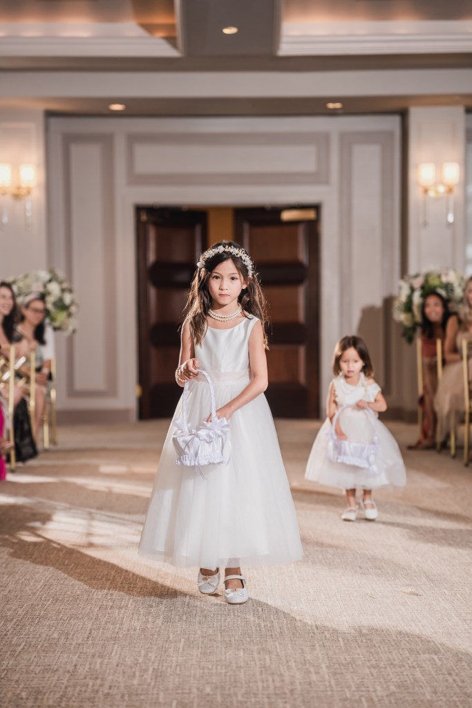 I also had junior bridesmaids and flower girls. To tie everything together, our junior bridesmaids had a light shade of pink dresses, and flower girls had a white dress with a pink bow in the back. Just like my wedding dress that also had a bow in the back.