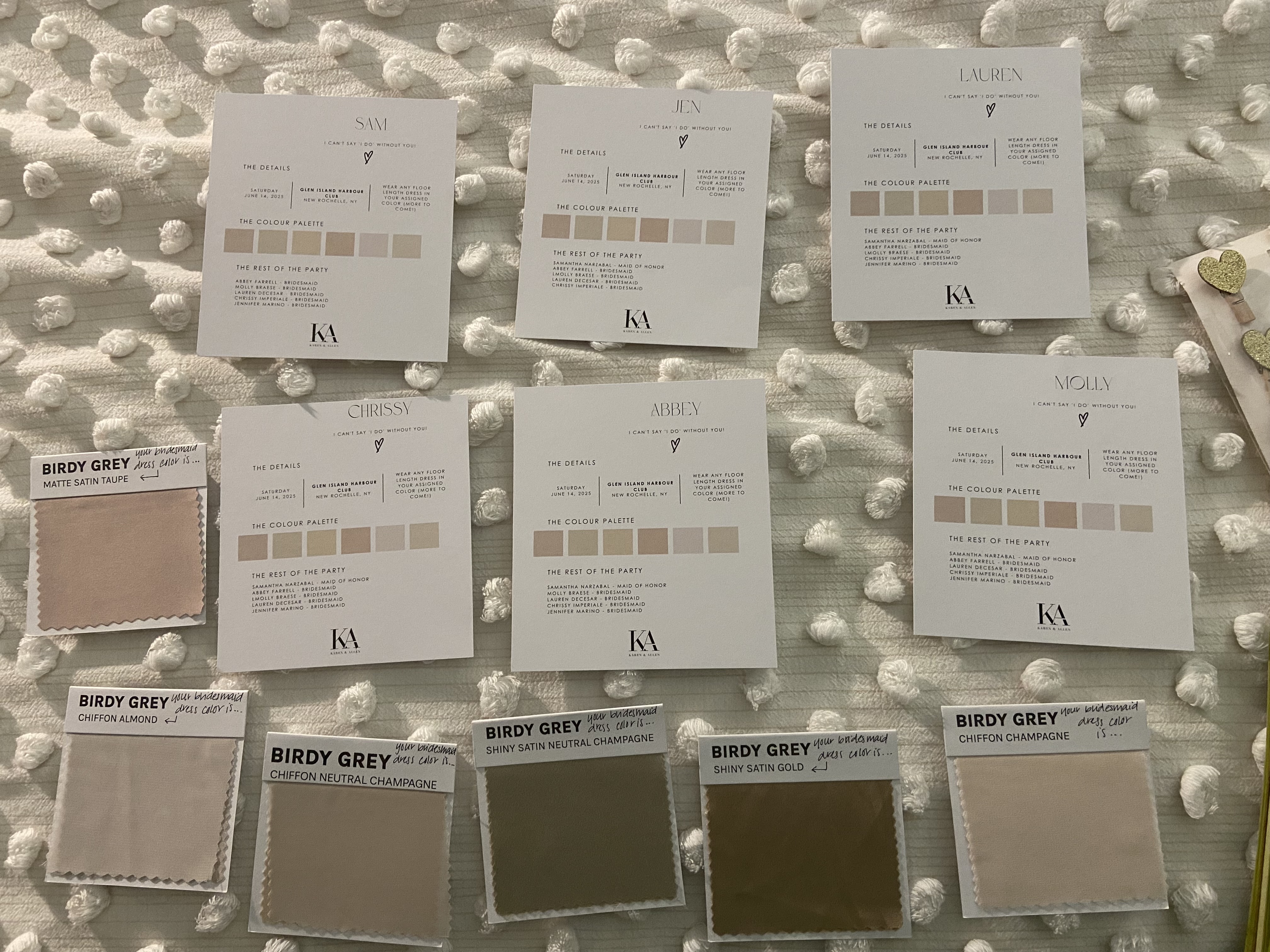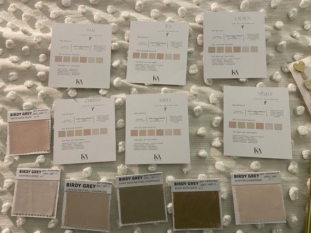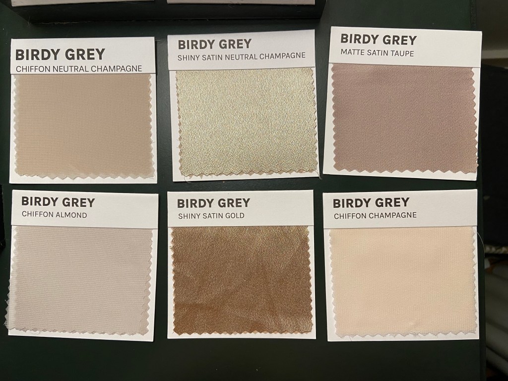 To bring this idea to life, I ordered a variety of fabric swatches from Birdy Grey. This step made all the difference — it allowed me to see how the colors and materials complemented each other in real life, not just online. More importantly, I was able to match each bridesmaid’s swatch to her skin tone, which made the final look feel intentional and flattering for everyone.