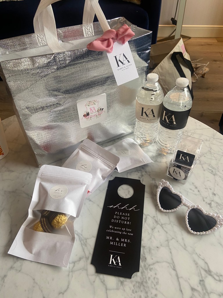 We wanted our guests to feel the theme from the moment they saw the bag waiting in their hotel room. We chose metallic gift bags from Amazon and topped each with a custom wedding crest sticker. Each bag had a welcome tag from Zazzle featuring our wedding logo (because yes — I was very committed to keeping everything on brand).