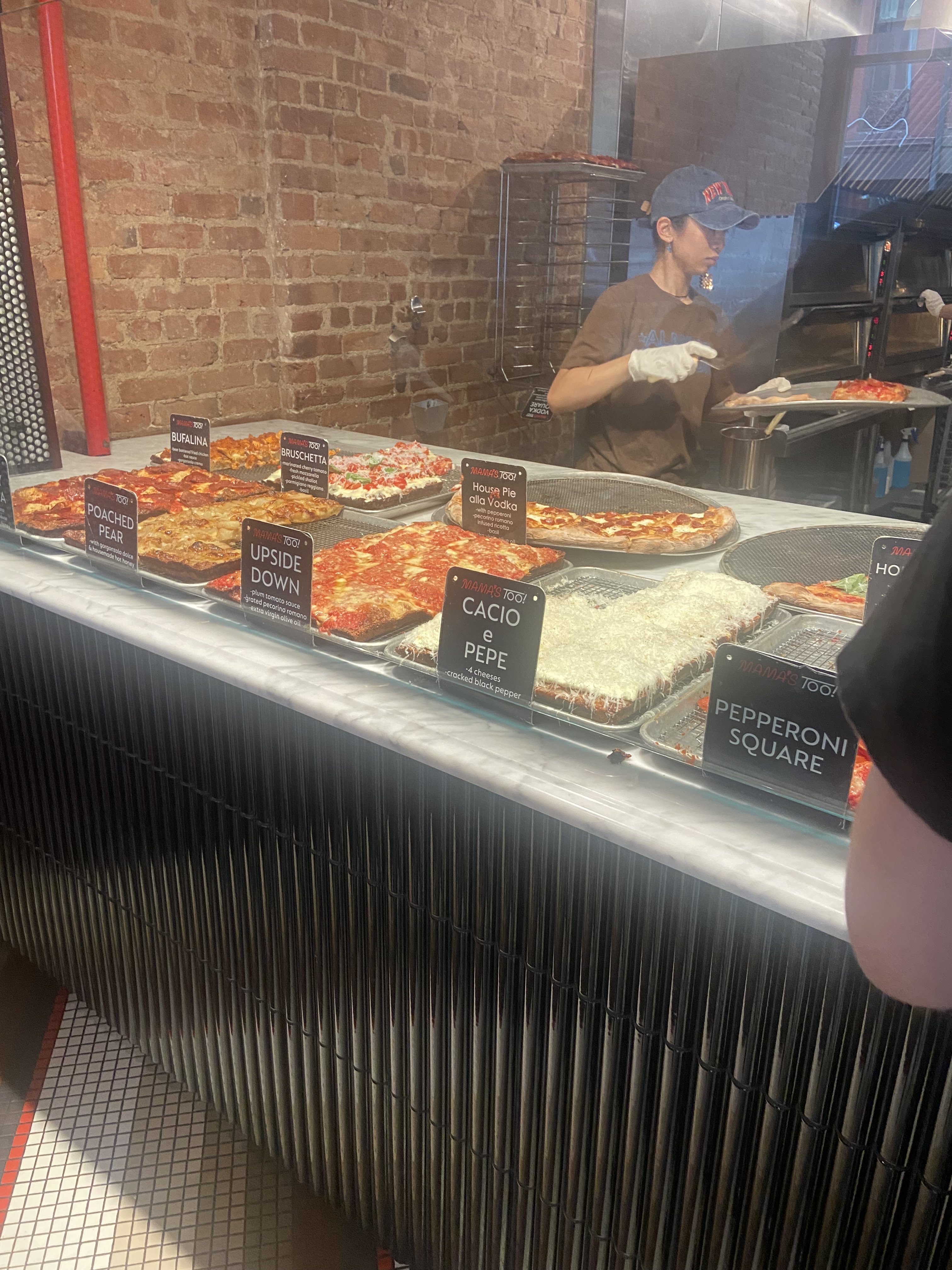 Mamas Too offers a cozy, casual vibe with plenty of seating and shorter lines, making it a convenient stop if you want a sit-down slice without the wait. We tried several slices: