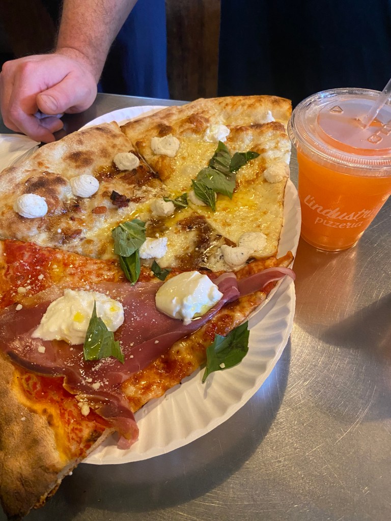 L’Industrie Pizza, on the other hand, won my heart. 10/10 hands down. While there’s usually a line, the staff is extremely efficient, handing out menus while you wait so you can decide ahead of time. My personal obsession: the frozen Aperol Spritz—refreshing and perfectly paired with pizza.