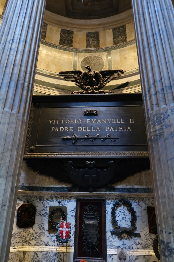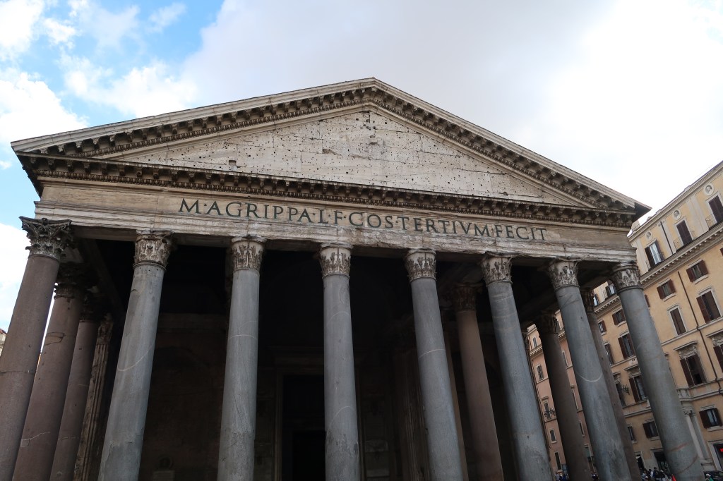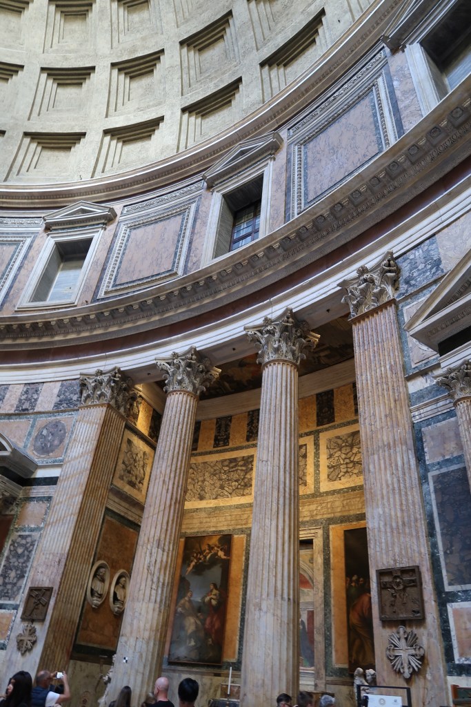 Pantheon – ancient and awe-inspiring. Remember to cover your shoulders and knees here; it’s both monument and sacred space. The Pantheon was originally built around 27 BCE by Marcus Agrippa but was completely rebuilt by Emperor Hadrian around 118–125 CE. Its name comes from the Greek words pan (all) and theos (gods), reflecting its original purpose as a temple dedicated to all Roman gods. The building is famous for its massive dome, which remains the world’s largest unreinforced concrete dome, and the oculus at its center, a circular opening that lets in natural light and symbolizes the connection between the temple and the heavens.