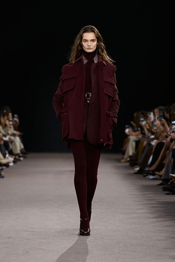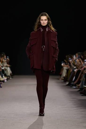 Max Mara’s FW25 runway embraced deep burgundy in a monochromatic palette: sculpted bodices, wide‐leg trousers and voluminous coats. This showcases burgundy/oxblood as a full outfit colour—not just an accent—giving it serious weight.